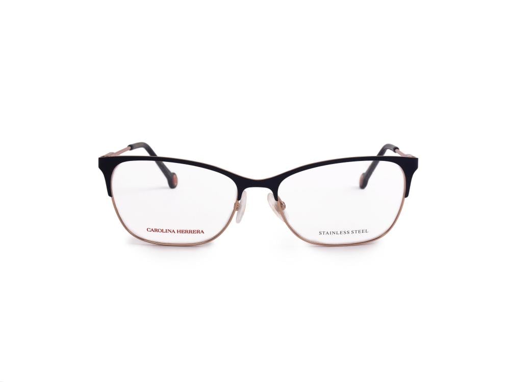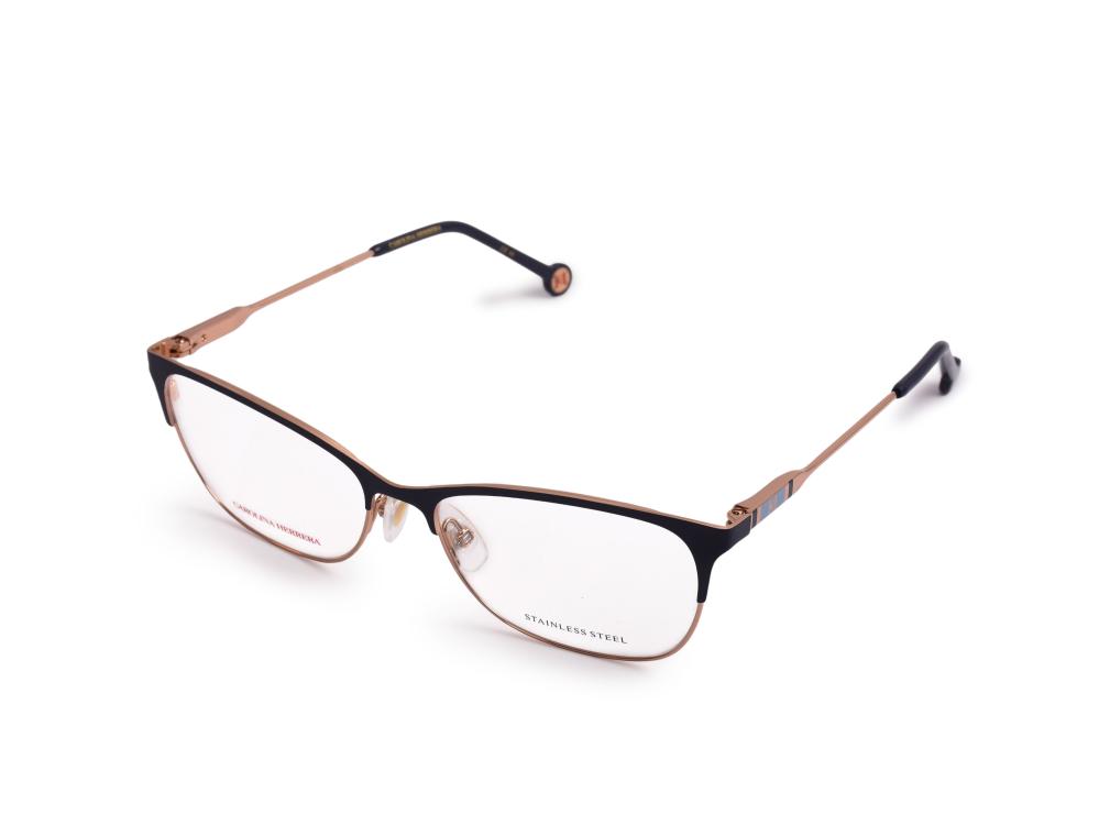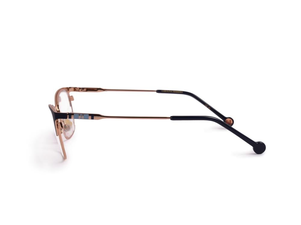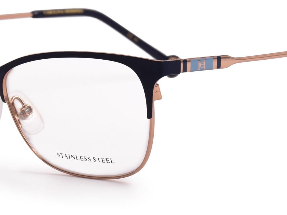 فريم كارولينا هيريرا مصنوع من ستانلس ستيل عالي الجودة باللون الازرق مع تفاصيل باللون الذهبي يتميز بتصميم عصري وأنيق يناسب مختلف أشكال الوجه وذراعين مصنوعان من المعدن باللون الذهبي الوردي مع نهايات بلاستيكية باللون الازرق لمزيد من الراحة والثبات وإطار مزين بتفاصيل دقيقة على الجوانب تضيف لمسة من الفخامة تصميمه
