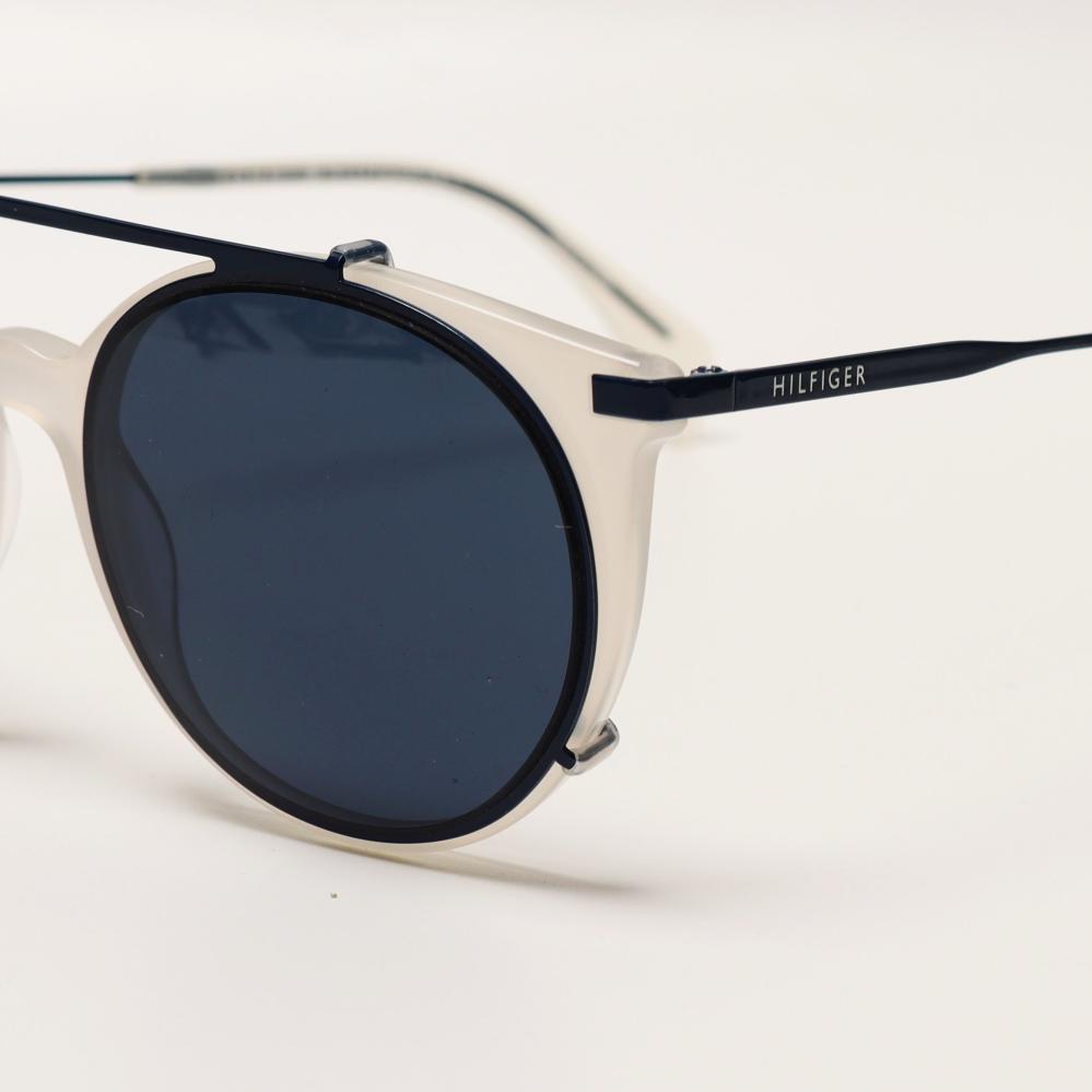 نظارة الشمسية تومي هيلفيغر تتميز بتصميم عصري وأنيق حيث تأتي بإطار دائري مصنوع من البلاستيك الأبيض مع لمسات زرقاء داكنة تضفي تبايناً جذاباً العدسات دائرية الشكل وملونة باللون الأزرق الداكن لتوفير حماية من أشعة الشمس وذراعين نحيفان ومصنوعان من المعدن الأزرق مع تفاصيل دقيقة تشمل حلقة صغيرة باللون الأحمر والأبيض والأسود في نهايات الذراعين نهايات الذراعين مغطاة بمادة بلاستيكية بيضاء لضمان الراحة عند الارتداء