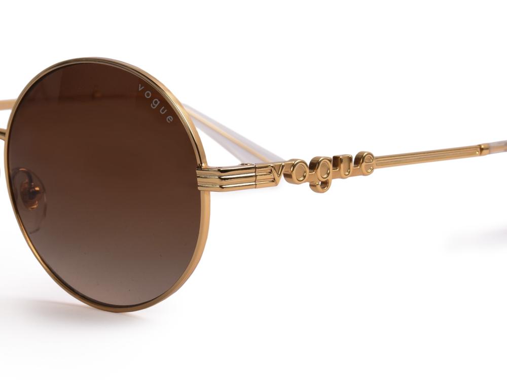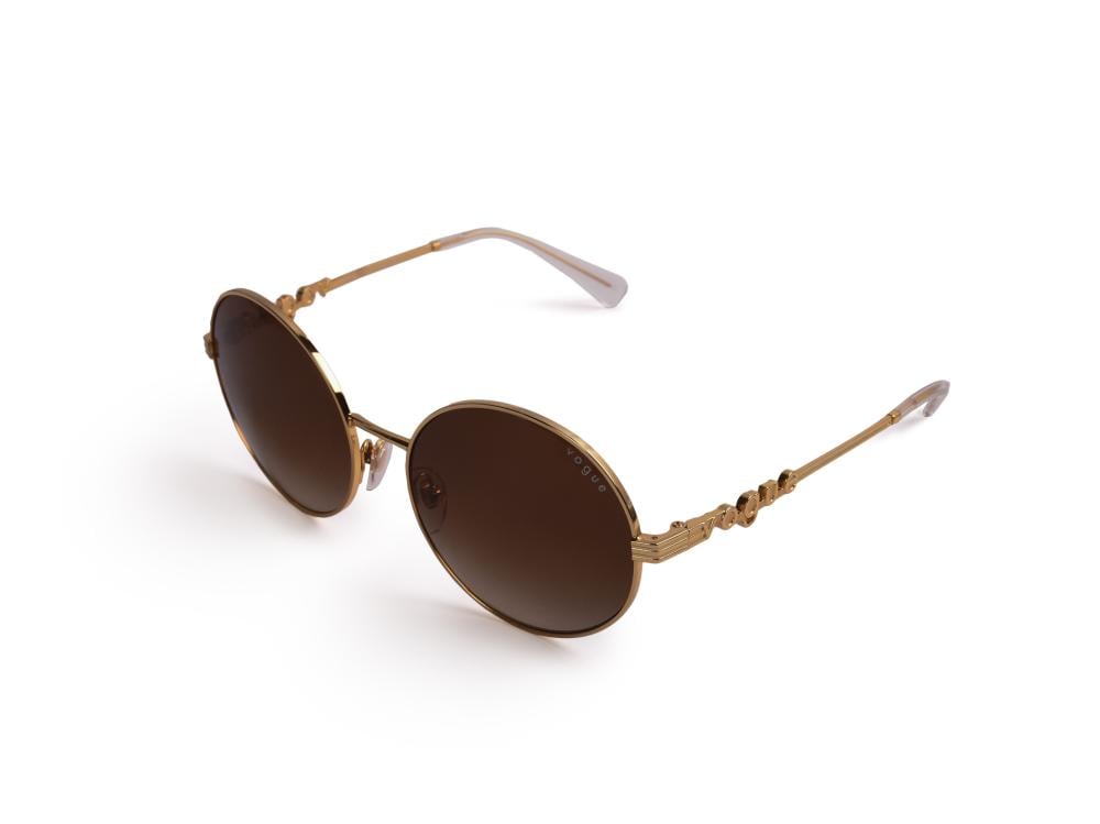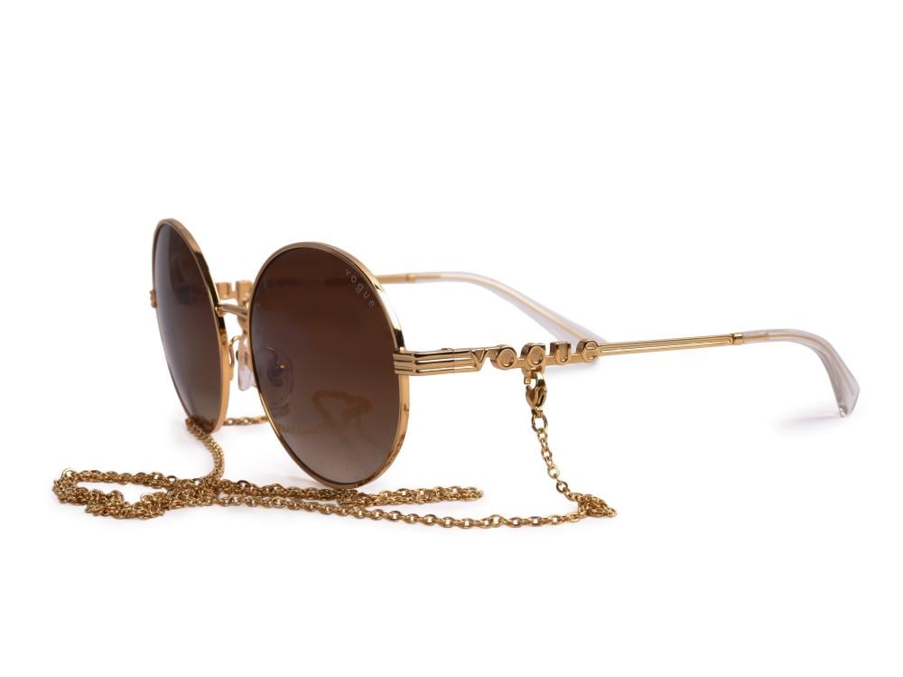 نظارة فوغ الشمسية مصنوعه من المعدن باللون الذهبي يتميز بتصميم دائري كلاسيكي وعدسات بنية متدرجة تضفي مظهرا أنيقا وذراعين نحيفان ومزينان بشعار بارز باللون الذهبي مع تفاصيل دقيقة تضيف لمسة فاخرة وإطار مزود بسلسلة ذهبية أنيقة قابلة للإزالة مما يجعله مثاليا للإطلالات العصرية والراقية وسادات الأنف شفافة وقابلة للتعديل لتوفير راحة إضافية أثناء الارتداء