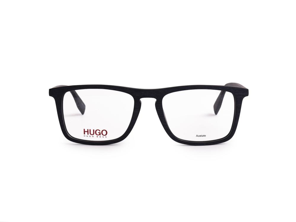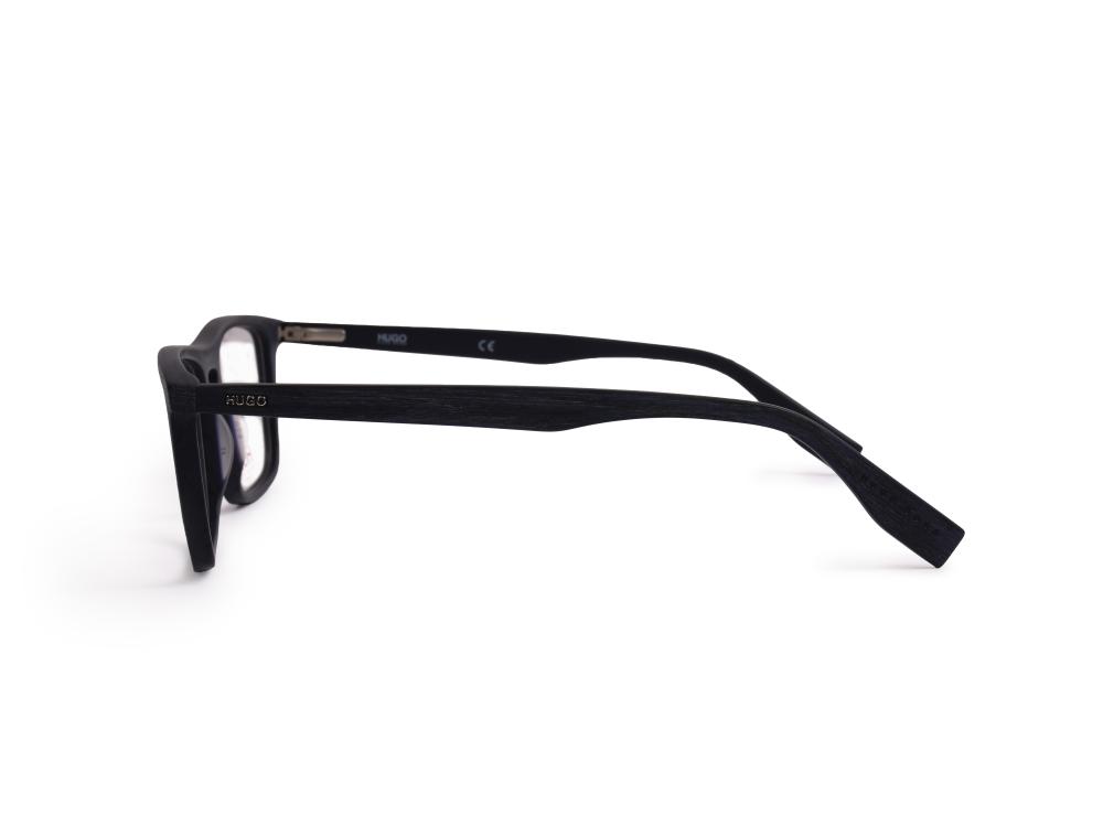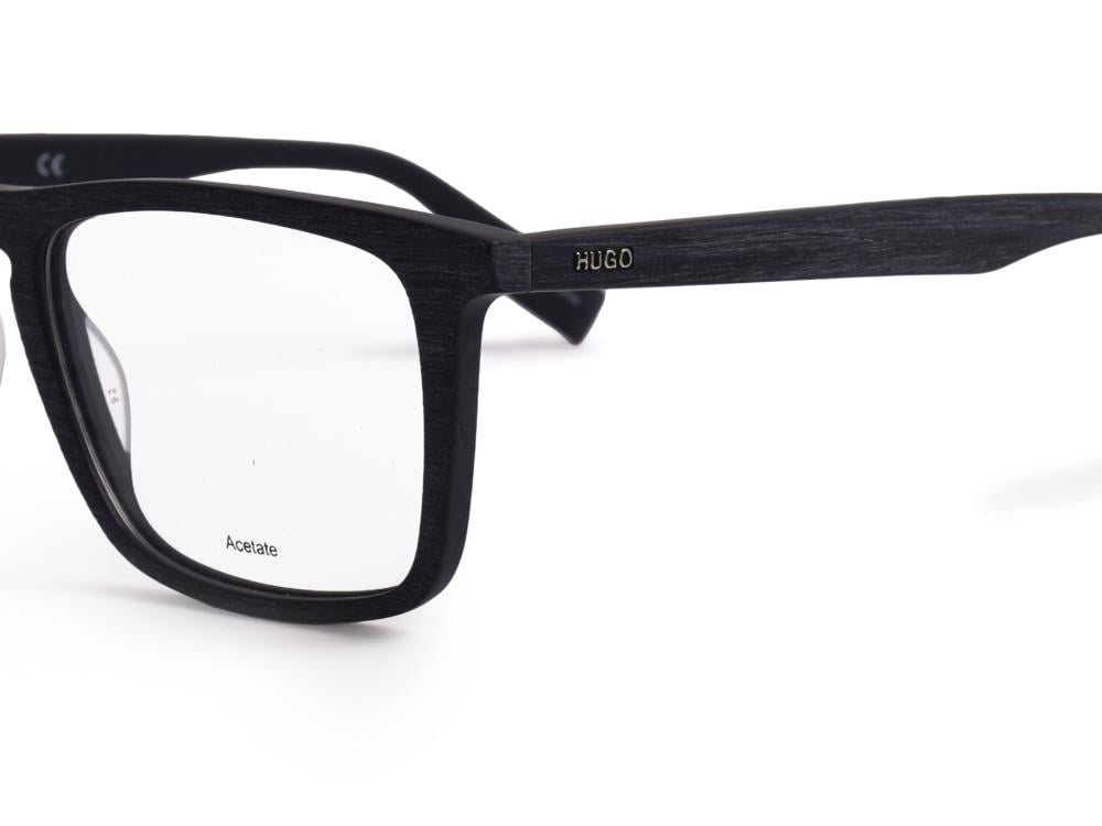 فريم هوقو مستطيل الشكل مصنوع من مادة الاسيتات باللون الاسود يتميز بتصميم عصري وانيق مع سطح خارجي بنقشة خشبية خفيفة وذراعين نحيفين ومسطحين مع كتابة شعار هوجو باللون الذهبي على الجوانب واطراف منحنية قليلا لتوفير راحة عند الارتداء التصميم مناسب للاستخدام اليومي ويعكس مظهرا كلاسيكيا